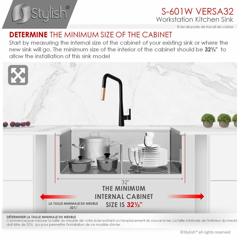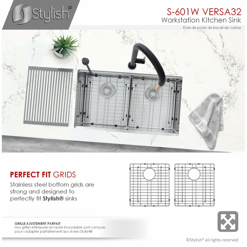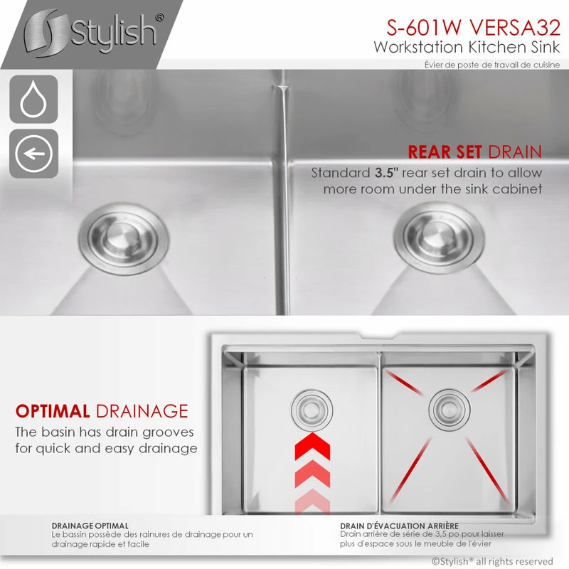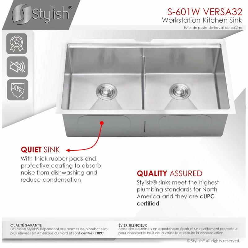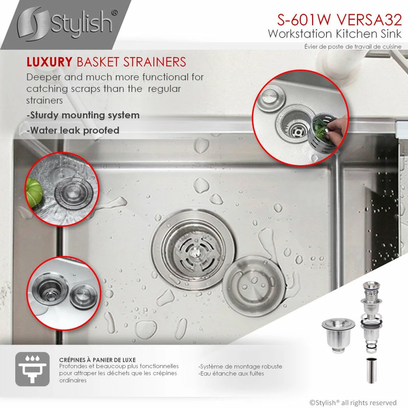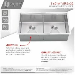 All Stylish sinks are equipped with a soundproofing system including a protective coating and extra-thick rubber pads to create a noticeable lower tone and overall a very quiet sink. This coat is sprayed underneath the sink to prevent water condensation. For added functionality, Stylish® VERSA workstation kitchen sinks come with luxury basket drain strainers, which are deeper and much more functional for catching food scraps than the regular strainers. Stylish® sinks are Canadian designed and meet the highest plumbing standards for North America. The sinks have drains towards the rear, for better utilization of the space under the sink cabinet. Also, sink basins have drain grooves for optimal drainage.