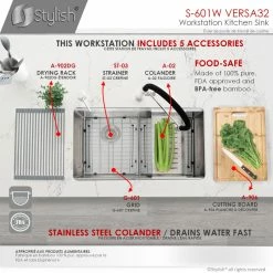 This kitchen sink workstation combines the best of both worlds: a stainless steel double bowl kitchen sink with a slim and low divider for convenient space usage, and a functional ledge sink with built-in accessories (colander, roll-up drying rack and cutting board) that slide on the integrated tracks of the sink to streamline meal prep and clean up without losing space on your countertop. This 16G stainless still workstation sink includes a stainless-steel COLANDER that you can use for straining, draining, sieving, and filtering tasks like straining fruits, vegetables and draining cooked pasta. This kitchen sink with CUTTING BOARD made of high-quality anti-microbial and BPA free bamboo will make it easy to chop any food, cut fruits and veggies over the sink. This ledge kitchen sink also contains a DRYING RACK convenient for drying or rinsing vegetables, fruits, dishware, knife, glasses and cups.