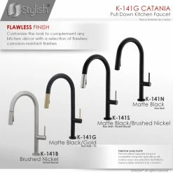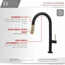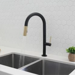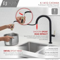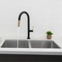 - Available in four finishes: Complement the décor of your kitchen with any of these four available finishes. 100% Matte Black, Matte Black with Brushed Nickel head/handle, Matte Black with Brushed Gold head/handle or 100% Brushed Nickel.