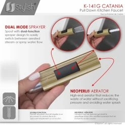 - Pull down two function sprayer: Easily and ergonomically switch from spray to stream. Aerated stream is perfect for filling water and spray mode is perfect for rinsing. With the pull-down sprayer you can easily access the entire sink area.