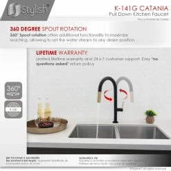 With its sharp, minimalist and contemporary design, this pull down kitchen faucet acts as a statement piece to your modern kitchen. The swivel spout head with dual adjustable water flow functionality is prepared to take on a range of uses, from cleaning, cooking or washing purposes. A single button allows you to instantly switch between aerated stream and spray. The pull down sprayer add even more convenience to this kitchen faucet, facilitating the access of the sink area. A 360 swivel spout is engineered with sustainable technology using an anti-drip guard mechanism to conserve water, eliminating the possibility of dripping or leakage. The kitchen faucet is also equipped with an ergonomic, single handle lever for optimal water and temperature control. This pull down kitchen faucet has been made with certified lead-free material and top-quality components ensuring superior performance and a faucet that will last a life time. This faucet comes with an ultra-durable Kerox ceramic cartridge which has been tested for over 500,000 cycles. Also, a best-in-industry Neoperl aerator that reduces the waste of water without sacrificing pressure. This pull down kitchen faucet fits a standard 35mm hole. It is very easy to install and can be installed in a single or three hole deck plate. Our deck plates are not included with the purchase of a kitchen faucet. For your convenience, the braided cold and hot water hoses are included. Customize the look of your pull down kitchen faucet to complement any kitchen décor. Choose from 4 flawless corrosion-resistant finishes, 100% Matte Black, Matte Black with Brushed Nickel head/handle, Matte Black with Brushed Gold head/handle or 100% Brushed Nickel. Your kitchen will be the envy off everyone when you install this gorgeous pull down kitchen faucet. Our streamlined kitchen faucet is the ideal asset for anyone seeking optimal efficiency in their utilities, without compromising style.