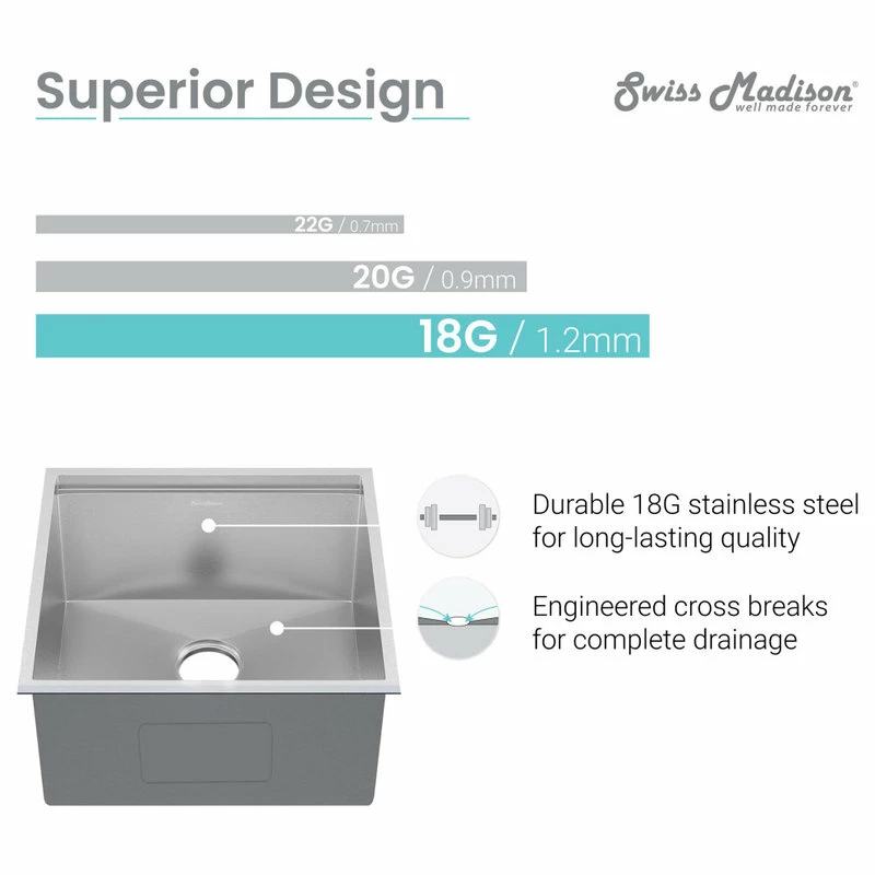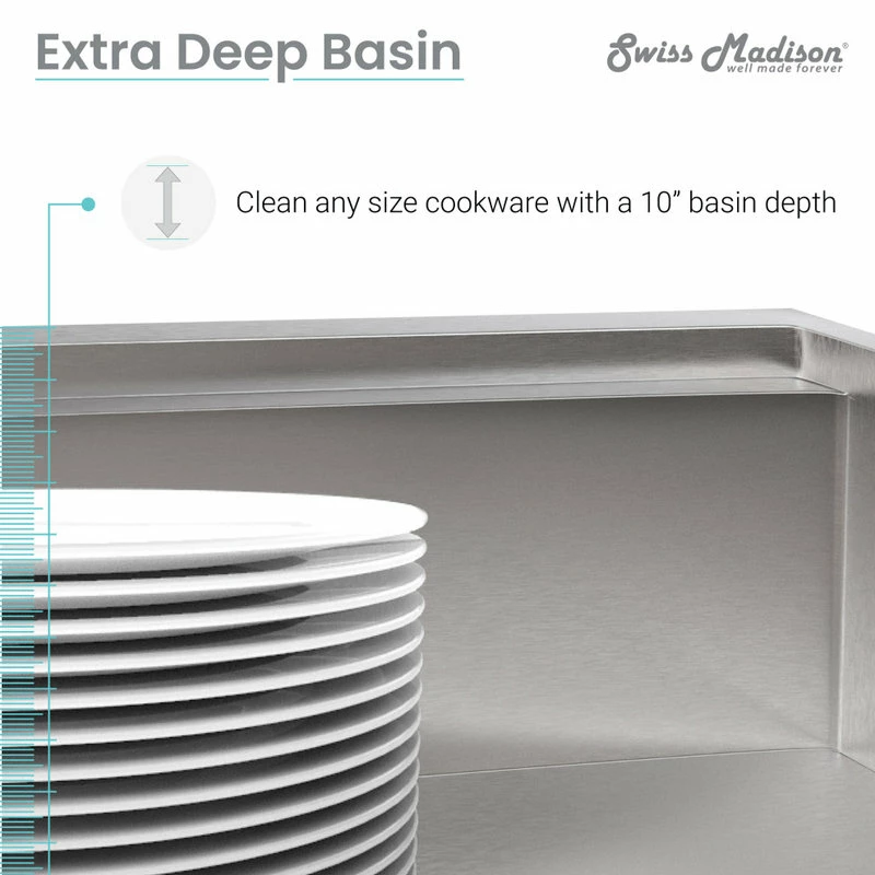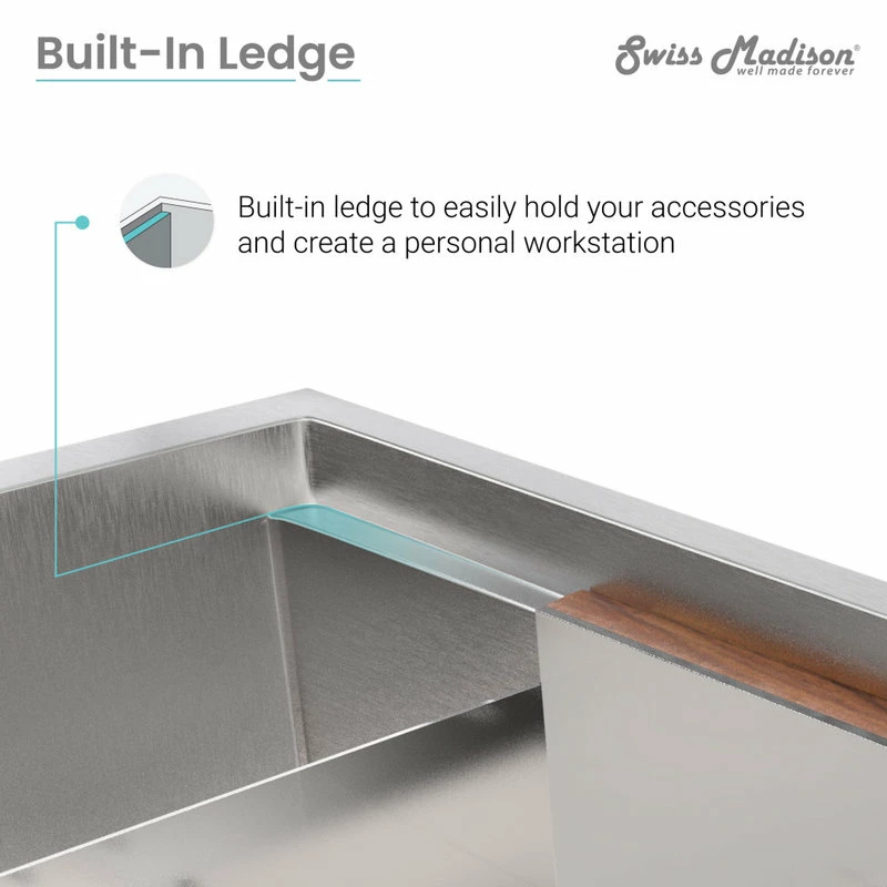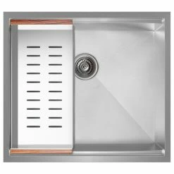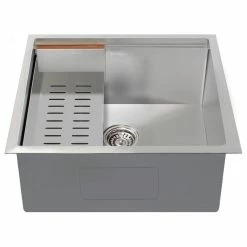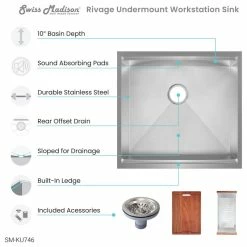 This Rivage Workstation Sink is the ultimate modern addition to any kitchen setting. From meal prep to cleanup, this stylish undermount single basin set comes with a strainer, colander, and cutting board, making your kitchen a streamlined workspace. Crafted with stainless steel, this product is durable and built to last. The deep bowl allows for uninterrupted space in washing and stacking dishes, along with other household tasks. Additionally, this product is stain and scratch resistant, along with being engineered to withstand high temperatures.