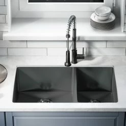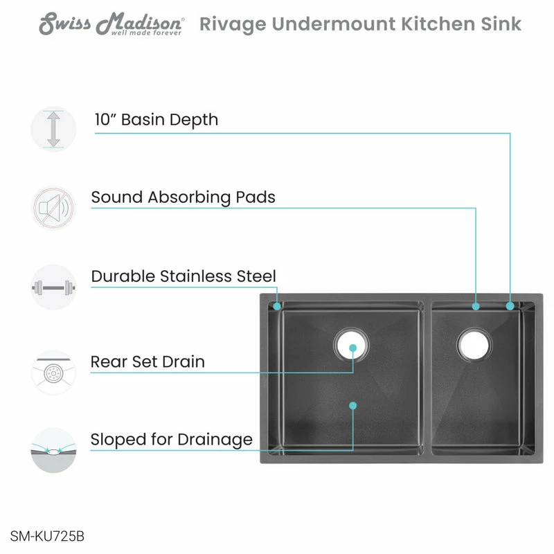 The Rivage Stainless Steel Dual Basin Undermount Sink is an enduring selection for any kitchen application. Its under-mounted design results in a smooth look and a flush mounting with any countertop material. A Rear offset drain allows for maximum undersink storage utilization.