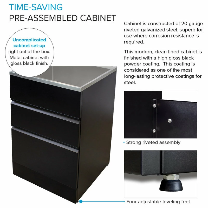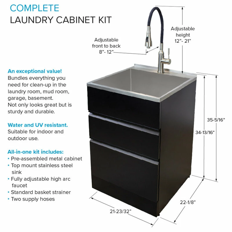 Transolid offers the most beautiful and durable laundry/utility sink cabinet by combining a metal laundry cabinet with a stainless steel sink and a high-arc Flex+Freeze stainless steel faucet. The pre-assembled cabinet provides a time-saving setup-up right out of the carton. Cabinet features a durable, 20-gauge stainless steel construction which is suitable for both indoor and outdoor spaces. Cabinet is covered by Transolid’s hassle-free 1-year limited warranty while the faucet is covered by a lifetime limited warranty
