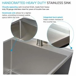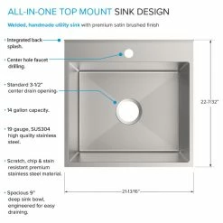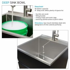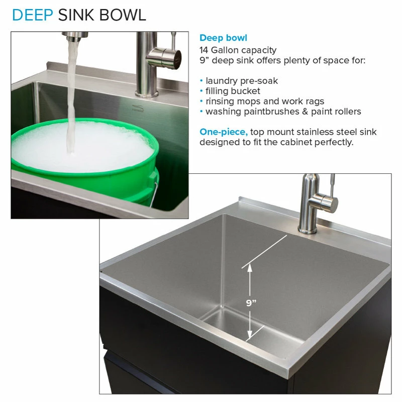LARGE SINK BOWL: 19-gauge stainless steel sink is 9-in deep with a capacity of 14 gallons, offering more room inside for large buckets and paint pans