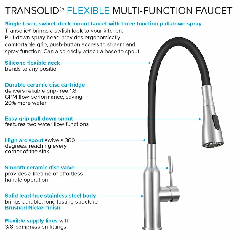 SUPERIOR FAUCET: Flex+Freeze stainless steel faucet with black silicone spout features dual function spray head, optional garden hose adapter, single lever handle, ceramic disc cartridge, and boasts an impressive 1.8 GPM flow rate