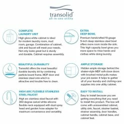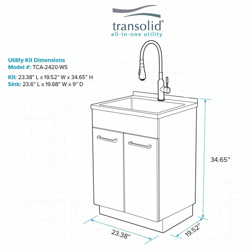 The Transolid TCA-2420-WS Laundry Cabinet combines beauty and convenience with its all-in-one functionality, featuring an easy-to-assemble shaker style cabinet, a spacious handmade stainless steel sink, and a multi-function faucet. The uniquely designed laundry/utility sink cabinet integrates seamlessly into many spaces, with its classic finishing look and durable components, offering ease of convenience, specifically for a laundry room, workshop, basement, or garage. Transolid offers a hassle-free 1-year limited warranty.