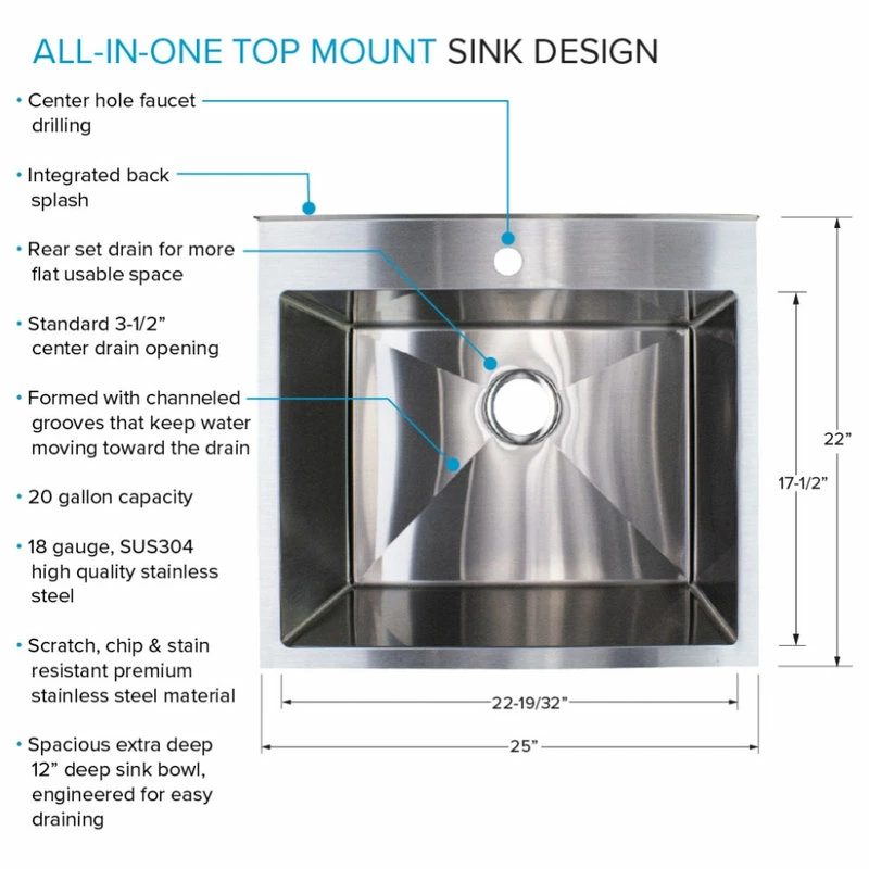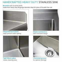 POWERFUL SINK: 18-gauge stainless steel sink is handmade and features a 10mm radius, integral backsplash, pre-drilled faucet hole, and sound deadening pads