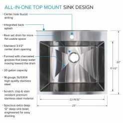 SINK MEASUREMENTS: Sink measures 17.5-in front to back (width), 22.5-in side to side (length), and is 12-in deep with a 20-gallon capacity