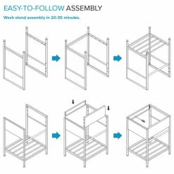 INCLUDES: Matte black wash stand with wrap-around apron (assembly required), stainless steel sink with center drain hole and strainer, flex neck faucet, and color-matched p-trap