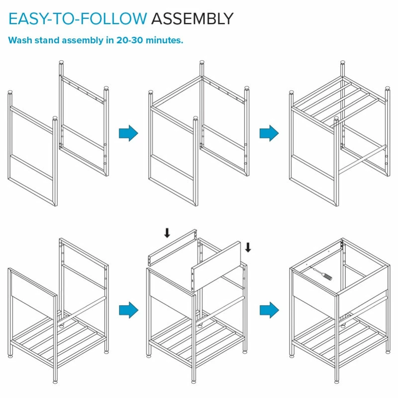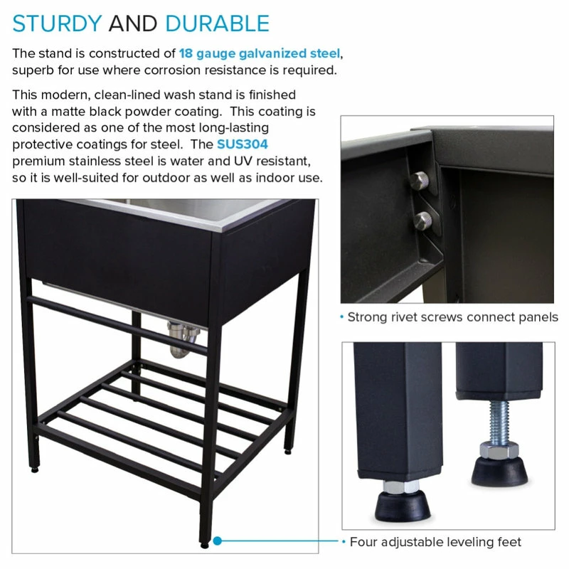 MODERN CONVENIENCE: Wash stand is constructed of 18-gauge stainless steel with an apron on front and sides; features adjustable feet and pre-drilled holes for optional wall mount installation