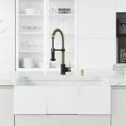The pull-down, dual action spray head on the VIGO Edison Pull-Down Spray Kitchen Faucet allows for your choice of aerated flow or powerful spray for all your modern kitchen needs. The 360 degree swivel spout extends up to 30 inches for ease of use and maneuverability. With spiral details and a solid brass construction, the Edison kitchen faucet is sure to be an immediate favorite in your home.