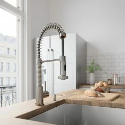 Taking inspiration from the industrial-chic design aesthetic, The Edison by VIGO showcases noteworthy details in a powerful design. The marriage of form and function reflects the high-quality craftsmanship and innovation that marks all of VIGO products. A premium 7-layer finish adds luxury to its commercial inspired design. A sleek spiral detail houses the extendable pull-down hose, making it just as beautiful as it is sensible. Ergonomic features like the 360-degree swivel spout and the dual-action spray head maximize your kitchen productivity. Its solid brass construction ensures a lifetime of lasting durability. The Edison pares kitchen design down to performance and elemental form.