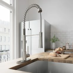 - RETRACTABLE SPOUT: Nylon braided house extends up to 22 inches for optimal maneuverability in the kitchen.